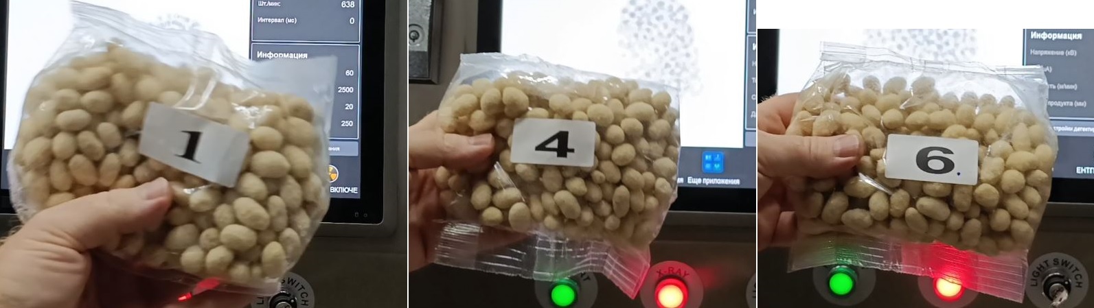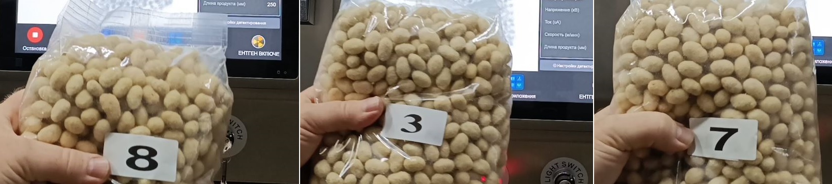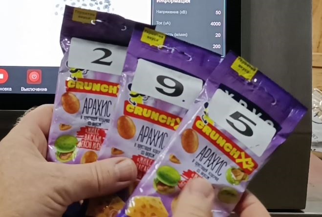 Чтобы наглядно продемонстрировать возможности пищевого рентгена Весталинк FXR 4017, были проведены контрольные испытания на образцах заказчика — пакетах с арахисом разного веса.
